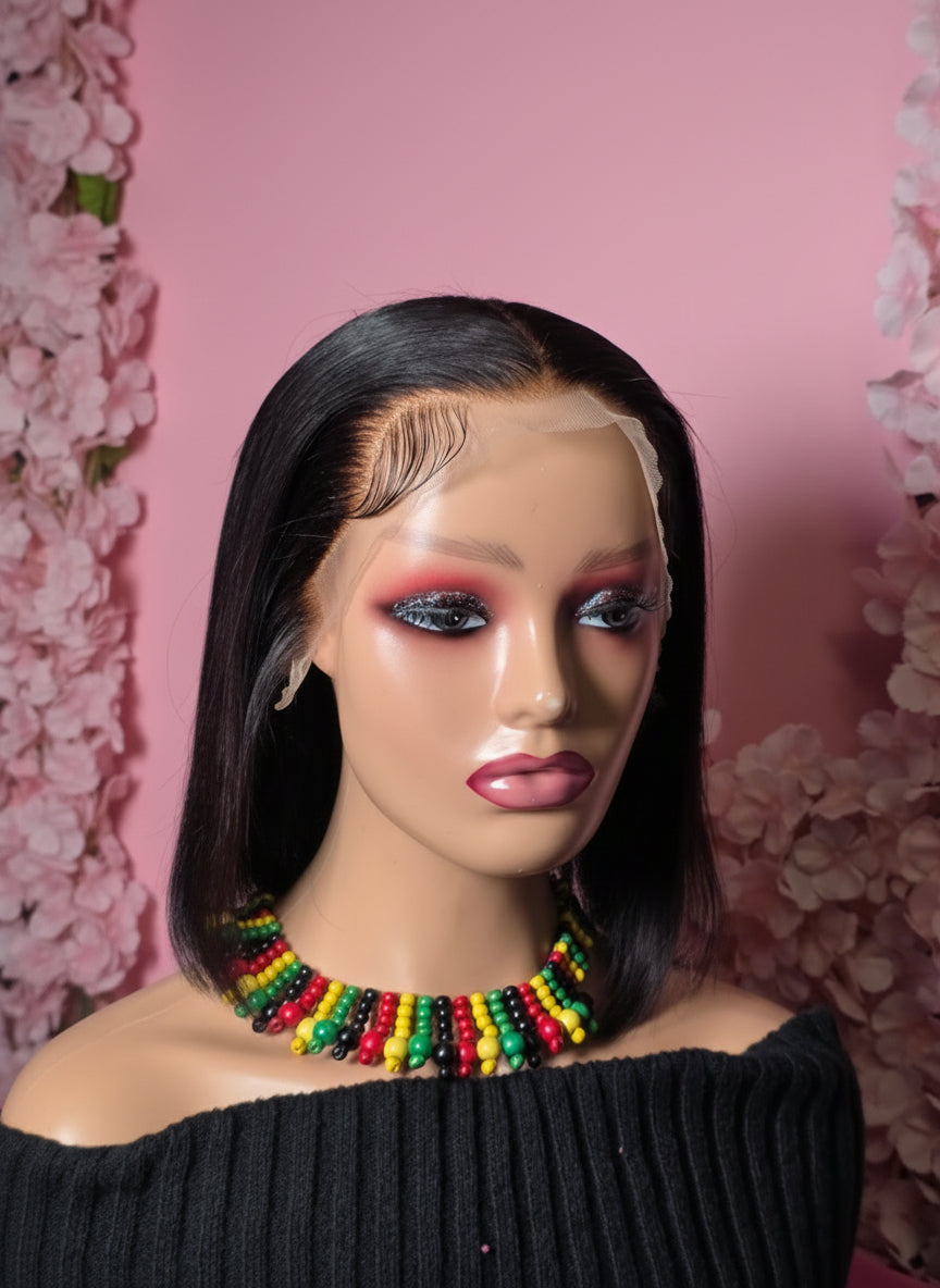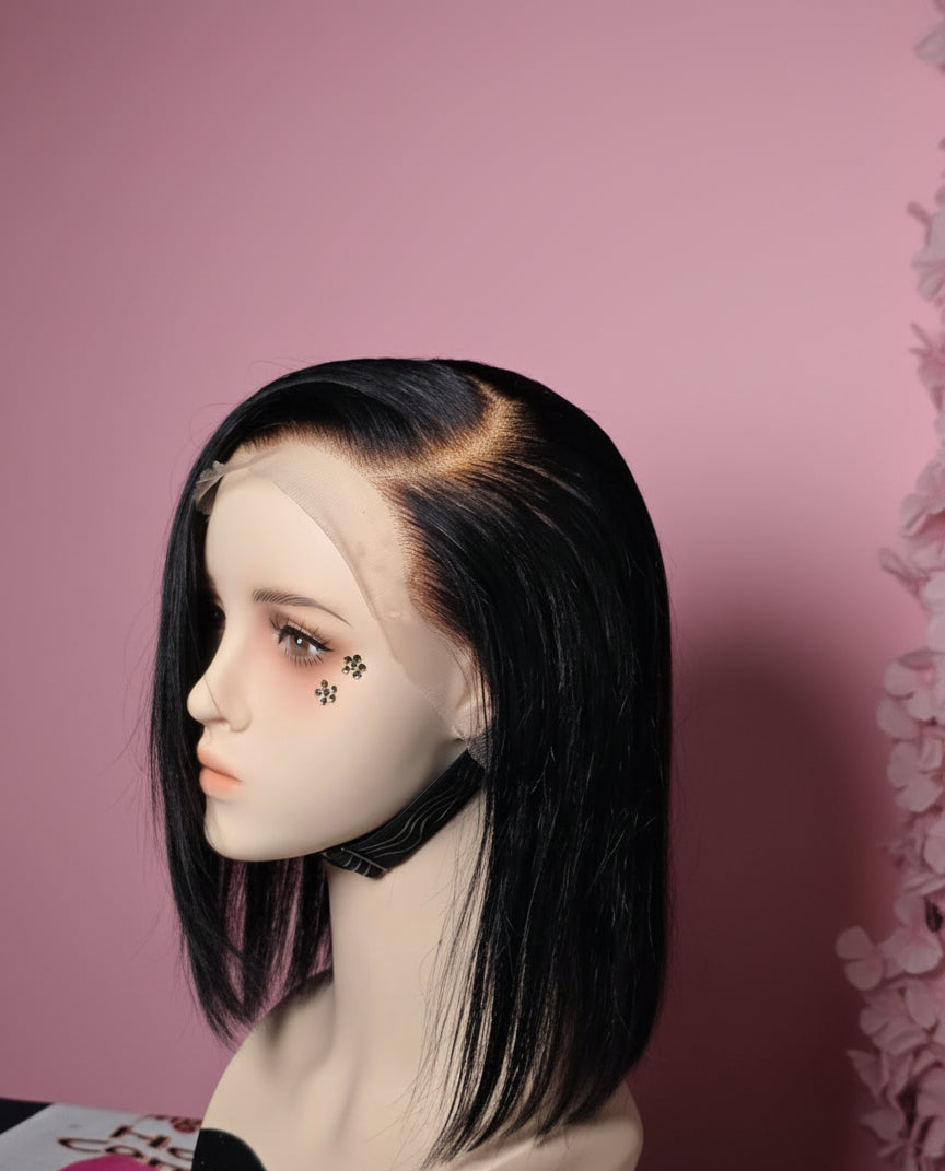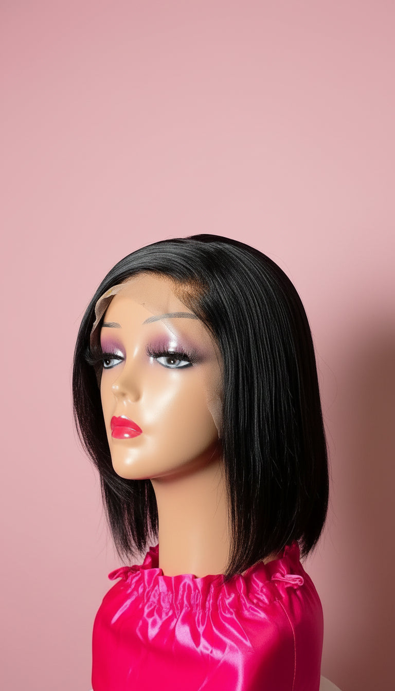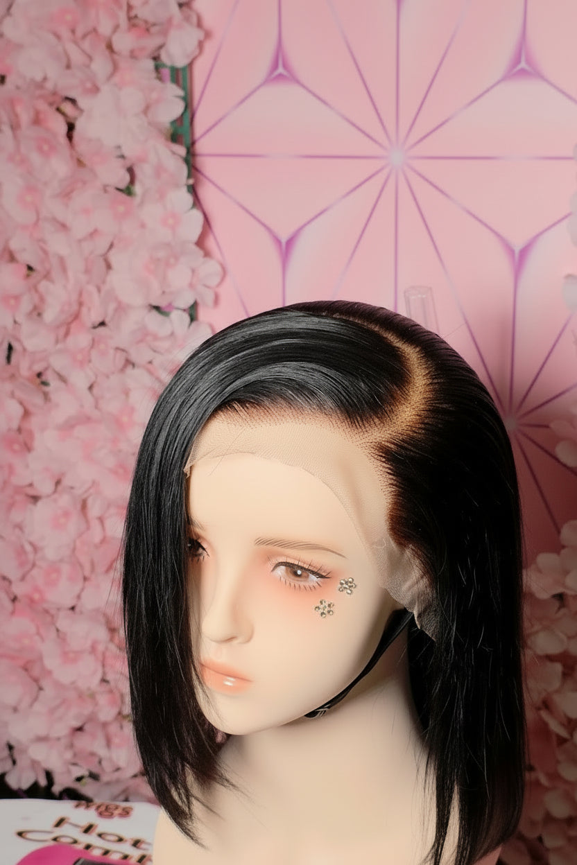 This luxurious bob human hair wig is a 13*4 lace frontal wig made of high-quality human hair, featuring a transparent lace panel that measures 13 inches across the front hairline and 4 inches back, offering a highly natural-looking, undetectable hairline and versatile parting space.