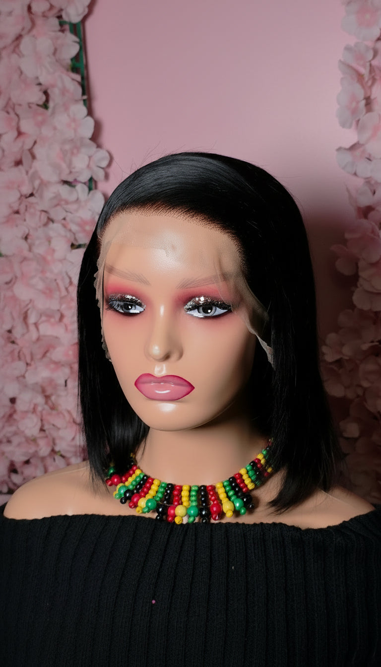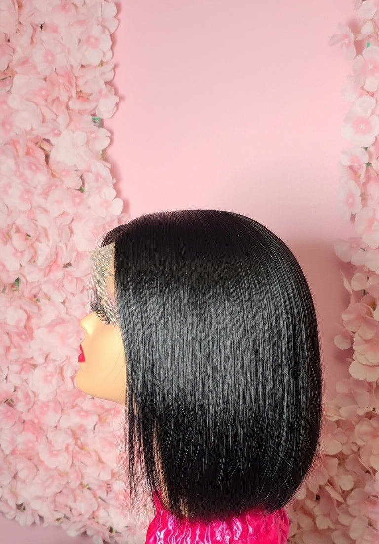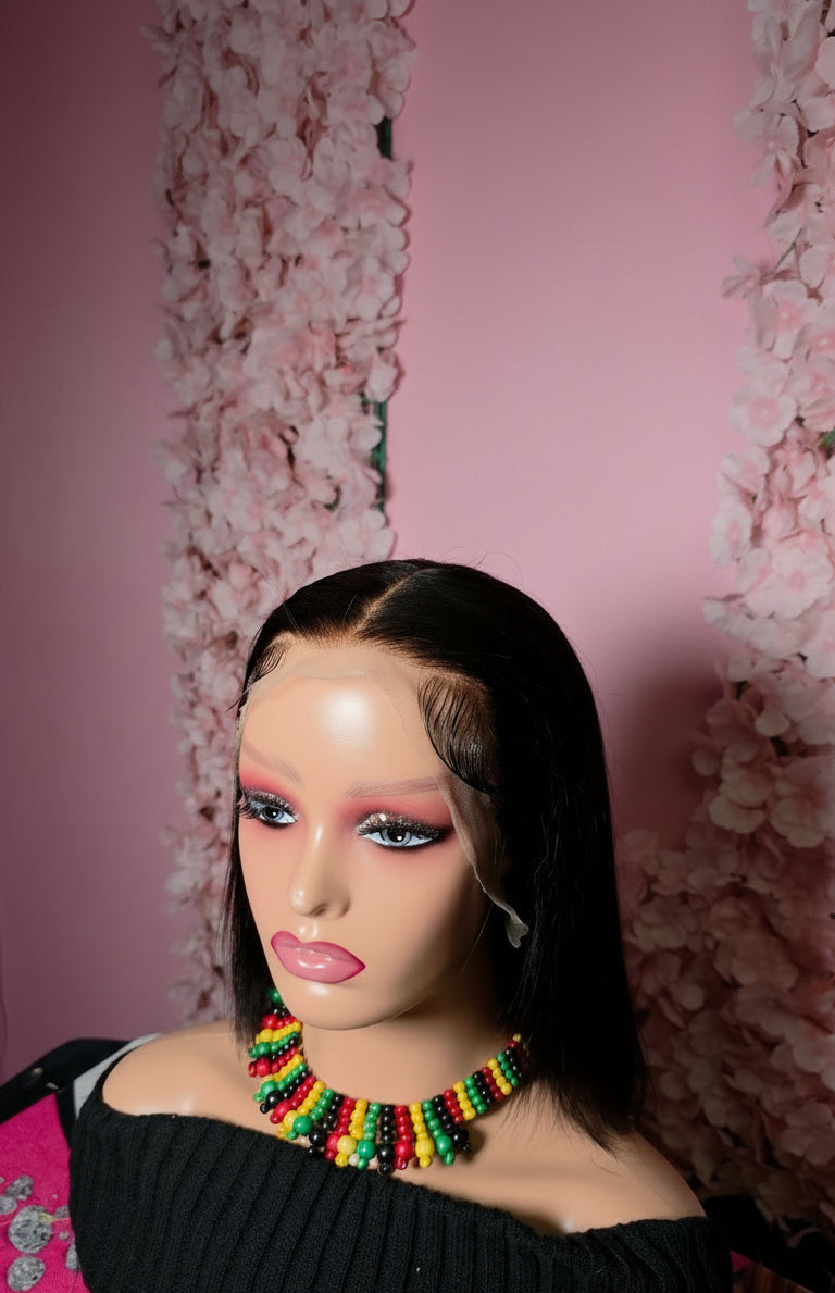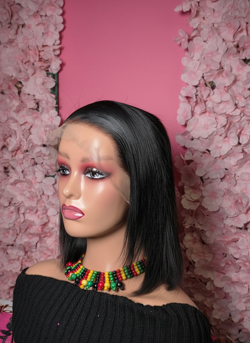 This luxurious bob human hair wig is a 13*4 lace frontal wig made of high-quality human hair, featuring a transparent lace panel that measures 13 inches across the front hairline and 4 inches back, offering a highly natural-looking, undetectable hairline and versatile parting space.